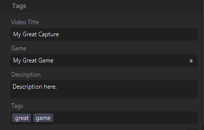 The Tags section of the Elgato Game Capture HD has fields where you can enter the Title, Game, Description, and Tags for your Recording.