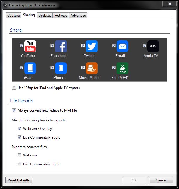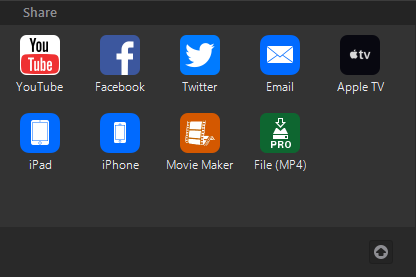 1) Sharing Destinations - You can choose what Destinations will appear in the software to Share completed recordings to, including YouTube, Facebook, Twitter, Email, Apple TV, iPad, iPhone, Movie Maker and a standard File (MP4).