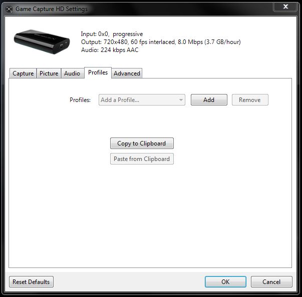 Return to the Game Capture HD Settings window, click on the "Profiles" tab and click on the "Paste from Clipboard" button.