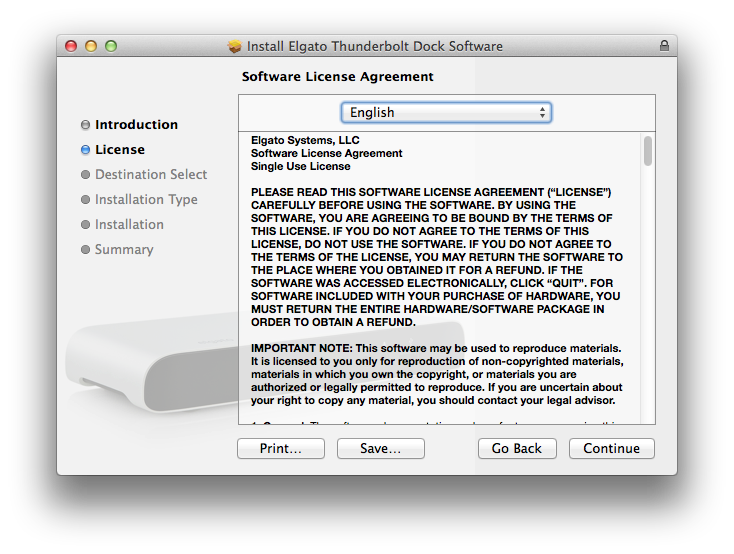 The Elgato Thunderbolt™ Dock Software Installer will install the Elgato Thunderbolt™ kernel extension and the Elgato Thunderbolt™ Dock Utility application.