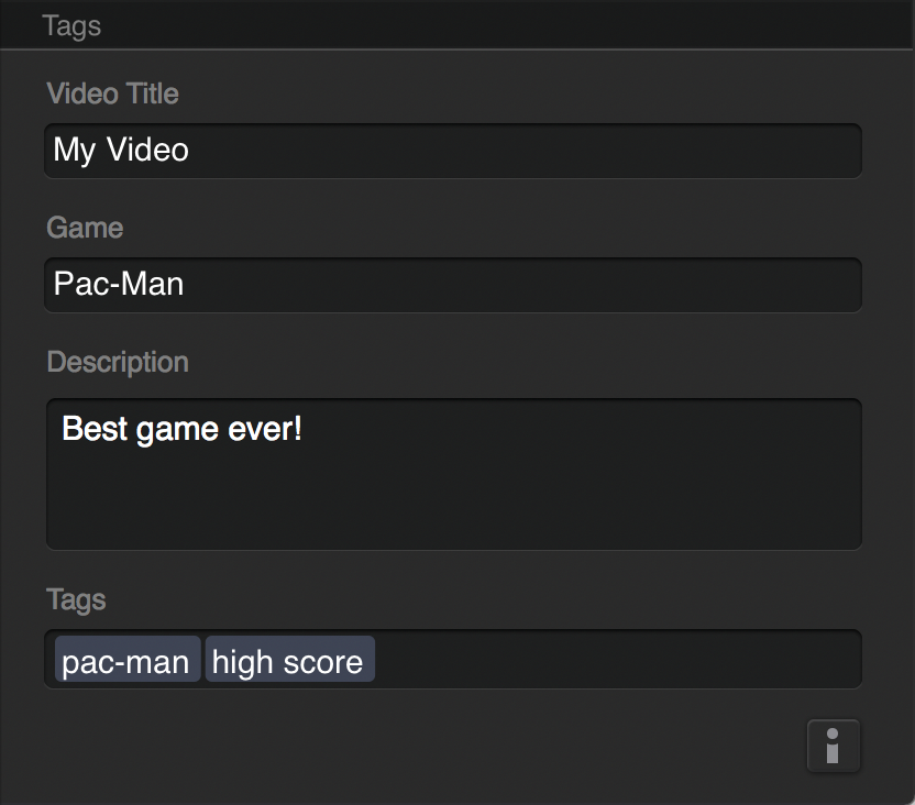 The Tags section of the Elgato Game Capture HD has fields where you can enter the Title, Game, Description, and Tags for your Recording.