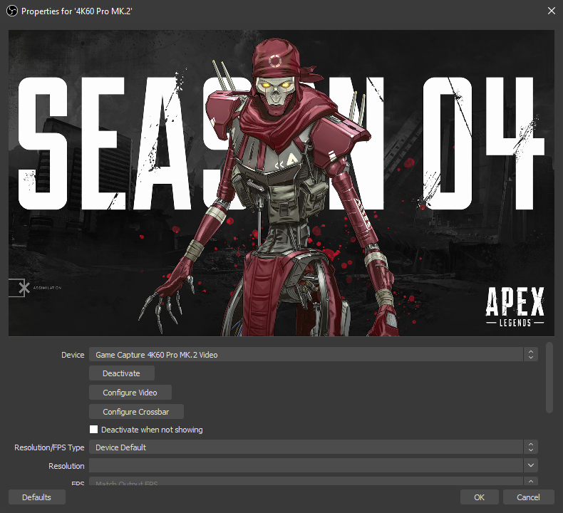 A new larger window with a preview will appear (seen below). This is asking you to choose the capture device from a list and to configure it. On the Device selection, choose “Game Capture 4K60 Pro MK.2 Video”.