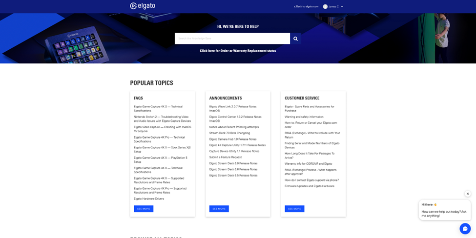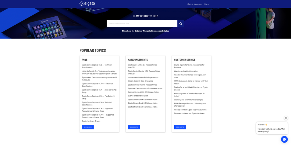 Once logged in, the home page for the support website (https://help.elgato.com ) will look like this: