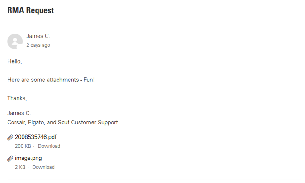 If you select a ticket, in this case “Test Ticket” you will see the entire support conversation history, along with the attachments that were included with each message. You can open or download any attachment by just clicking on it.