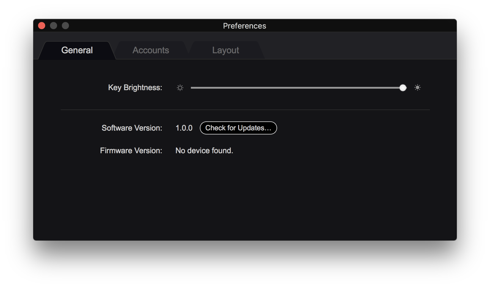 Vous pouvez également voir la version du logiciel (Software Version) et la version du programme interne (Firmware version). Cliquez Check for Update... pour savoir si une nouvelle version du logiciel est disponible au téléchargement. Si un bouton Update Firmware... est affiché à côté de la version du programme interne, cliquez ce bouton pour mettre à jour le programme interne du Stream Deck.