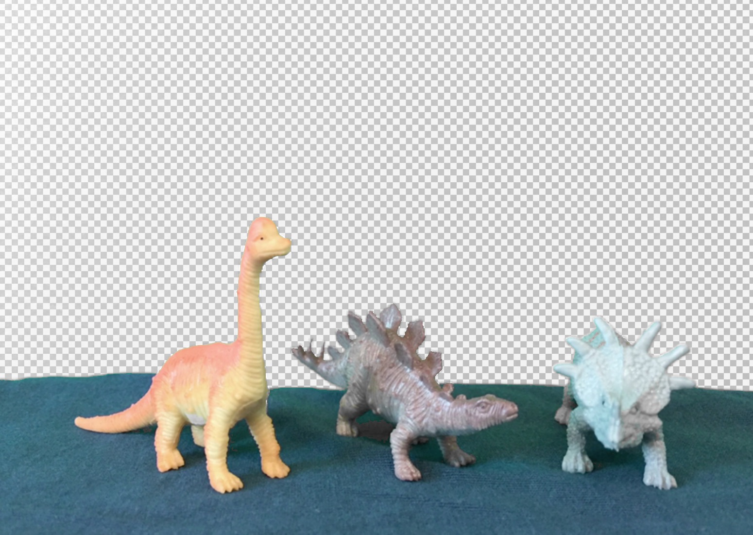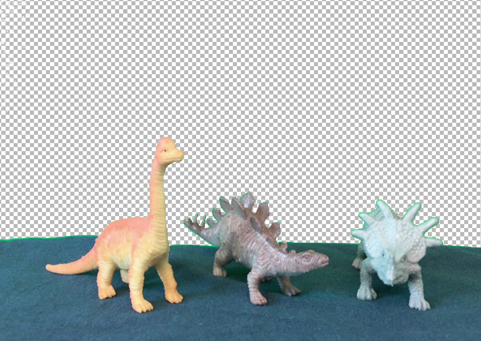 Dans l'exemple ci-dessous, la tolérance est trop haute, trop de vert est éliminé et certaines parties vertes des dinosaures en avant plan ne sont plus visibles :